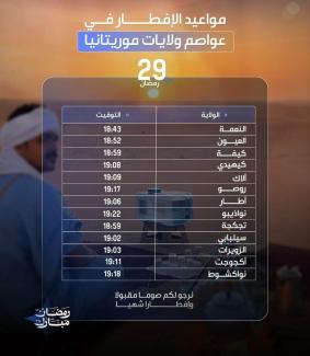 أوقات إفطار اليوم الـ29 من رمضان في عموم موريتانيا