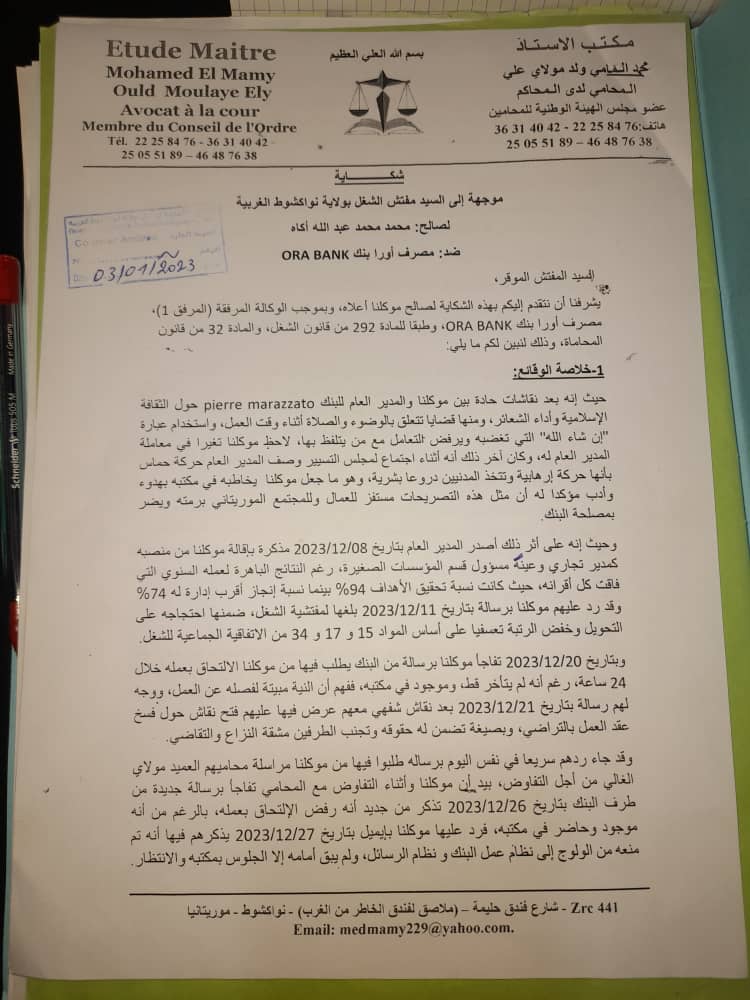 موظف فصله "أورا بنك" يتقدم بشكوى لمفتشية الشغل ويطالب بتعويض