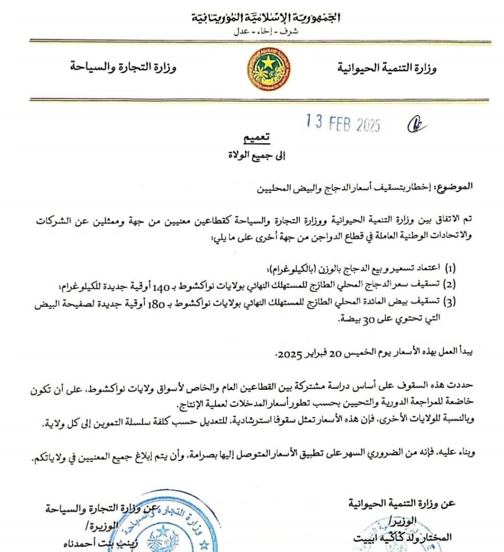 تسقيف أسعار الدجاج والبيض المحليين في ولايات نواكشوط