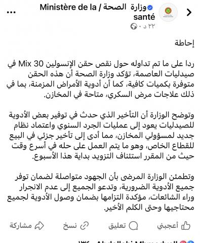 وزارة الصحة تقول إن حقن الإنسولين Mix 30 متوفرة و تشرح سبب اختفائها في الصيدليات