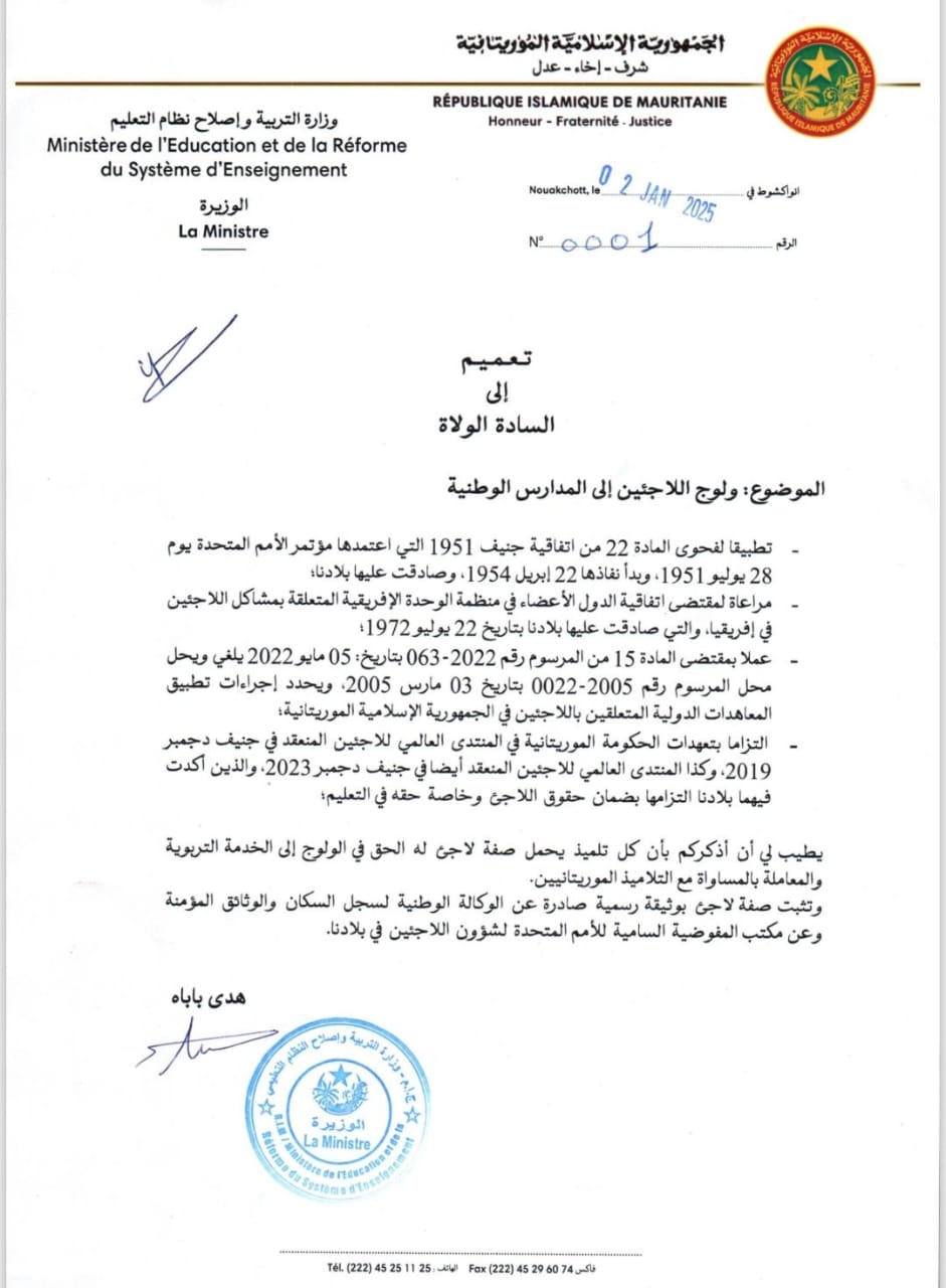 تعميم بمساواة كل تلميذ يحمل صفة لاجئ مع التلاميذ الموريتانيين