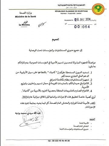 ألزم وزير الصحة عبد الله ولد وديه مديري المستشفيات والمؤسسات الصحية الخاضعة لوصاية قطاعه بضرورة تسديد الديون المستحقة لمركزية شراء الأدوية (كاميك)، عبر منح الأولوية لاقتطاع تلك الديون من الدعم المالي الجاري منحه لمؤسساتهم
