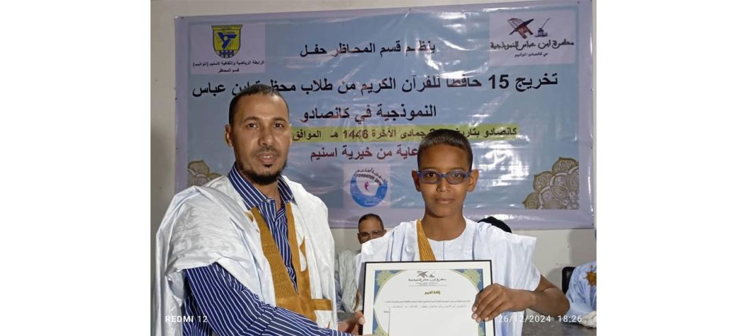 نظم قسم المحاظر التابع للرابطة الرياضية والثقافية للشركة الوطنية للصناعة والمناجم “اسنيم”، مساء أمس الخميس بمقر الرابطة بحي كانصادو في انواذيبو، حفلا لتكريم الدفعة الأولى من حفظة القرآن الكريم، وعددهم 15 حافظا لكتاب الله تخرجوا من محظرة ابن عباس النموذجية.