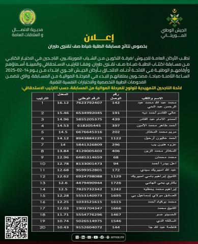 أعلن الجيش الموريتاني لائحة أسماء الناجحين في الاختبار الكتابي لمسابقة اكتتاب الطلبة ضباط صف تقنيي طيران، وفقا للترتيب الاستحقاقي.